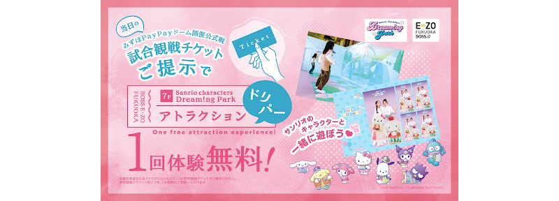 3月3日(火)~みずほPayPayドーム開催公式戦最終日まで、みずほPayPayドーム開催公式戦のチケットをご提示すると、BOSS E・ZO FUKUOKA 7F「サンリオキャラクターズ ドリーミングパーク」内のアトラクションが1回体験無料になるキャンペーンを実施!野球観戦にもぴったりなドリパーオリジナルグッズを販売しています!この機会に、ご家族やご友人とぜひお立ち寄りください☆