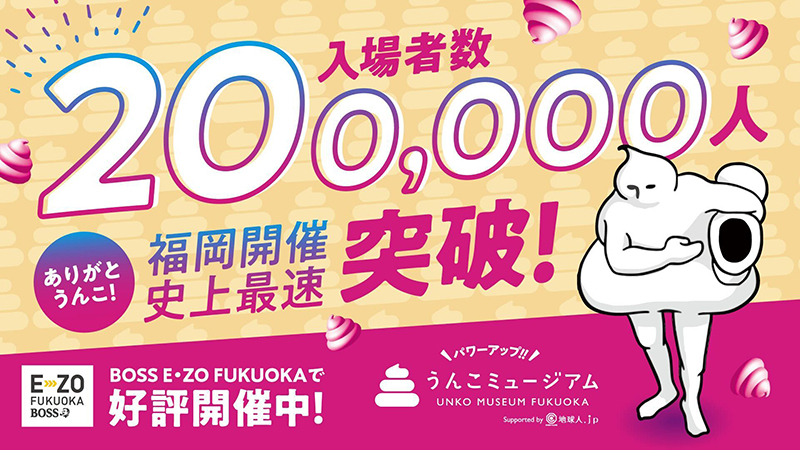 BOSS E・ZO FUKUOKA イベントホールにて開催中の「\パワーアップ!!/うんこミュージアム FUKUOKA Supported by地球人.jp」の入場者が11月18日(火)に、福岡開催史上最速で20万人を突破しました!これを記念し20万人目のお客様に、うんこミュージアムの守り神・ウンベルトより特別なプレゼントを贈呈いたしました。うんこミュージアムFUKUOKAは11月30日 (日)までの開催です!まもなくフィナーレのうんこミュージアムFUKUOKA!最後の最後、駆け込みでうんこミュージアム FUKUOKAで遊ぼう!