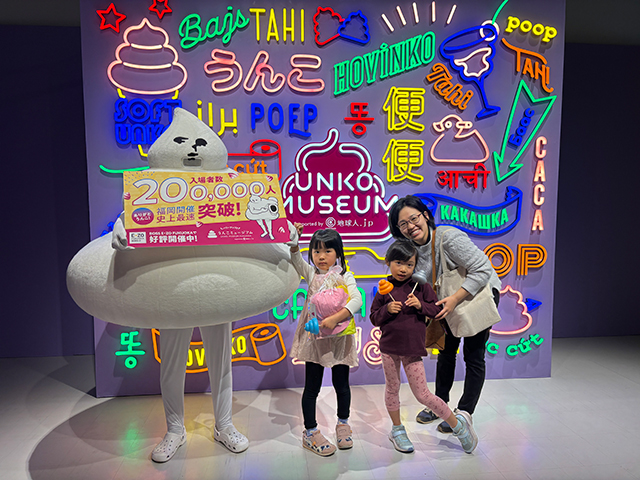 長崎からうんこミュージアムにご来場いただいた記念すべき20万人目のウンカー(うんこを出す人々)のご家族をウンベルトがお祝いいたしました!