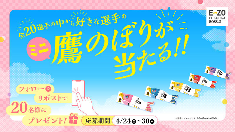 BOSS E・ZO FUKUOKAでは、5月6日(水・休)まで福岡ソフトバンクホークスオリジナルこいのぼりの装飾を開催!開催を記念して4月30日(木)までにBOSS E・ZO FUKUOKA公式Xをフォロー&対象の投稿をリポストした方の中から抽選で20名様に全20選手の中から1つミニ鷹のぼりをプレゼントいたします。