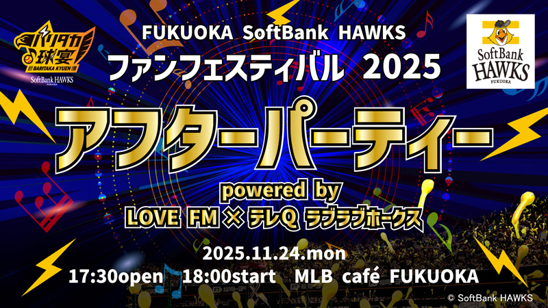 11月24日(月・休)のファンフェスティバル2025の後は福岡のFMラジオ局「LOVE FM」内の番組「テレQラブラブホークス」とコラボしてアフターパーティをMLB café FUKUOKA にて開催☆♪ホークス選手の乾杯でスタートし、ホークスOB柴原洋さんやテレQのアナウンサーの皆さんと今年のシーズンを振り返ります!さらにホークス選手のサイン入り試合球が当たる抽選会も☆チケットの発売は10月25日(土)10:00~! MLB café FUKUOKAのグルメを召し上がりながらイベントをお楽しみください♪