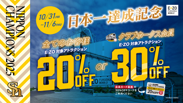 E・ZO対象アトラクションが20%OFF!クラブホークス会員は30%OFF!
