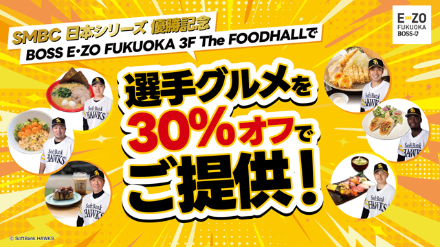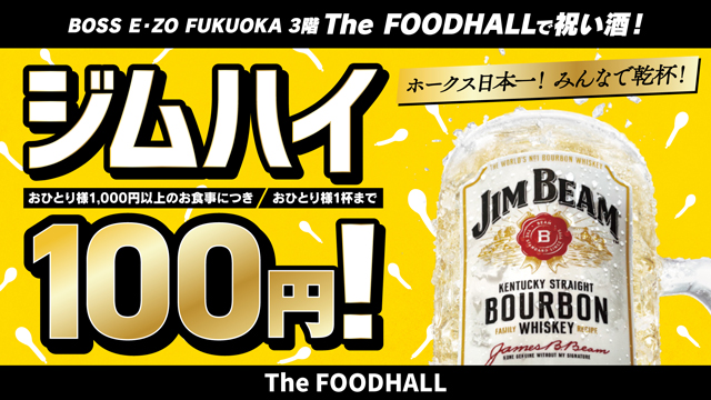 BOSS E・ZO FUKUOKA 3F「The FOODHALL」では優勝を記念して、対象の選手グルメを通常価格の30%OFF、そして祝い酒としてジムビームハイボールを100円で提供いたします。