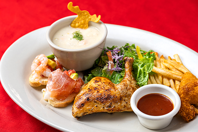 | 商品内容 | 香ばしく焼き上げたローストチキンに、生ハムと海老のブルスケッタ、チーズフライを添えた贅沢な冬のプレート。クリーミーなクラムチャウダーとともに、心も温まるひと皿に仕上げました。 |