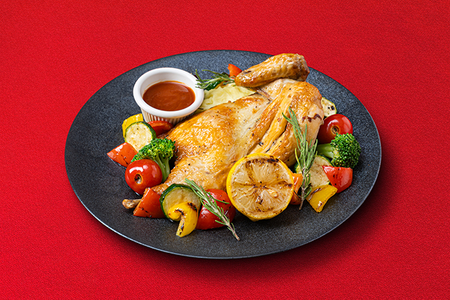 | 商品内容 | ブイヨンで蒸し焼きにしたチキンを、ハーブソルトで香ばしくロースト。外はパリッと、中はしっとりジューシーに仕上げました。彩り豊かな焼き野菜が、冬の食卓を華やかに彩ります。 |