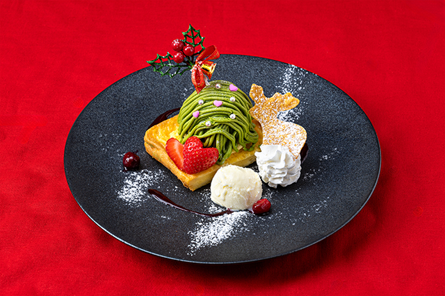 | 商品内容 | ふんわり焼き上げたフレンチトーストに、抹茶のモンブランをツリーのように重ねた12月限定スイーツ。やさしい甘さとほろ苦さが広がる、冬のご褒美デザートです。 |