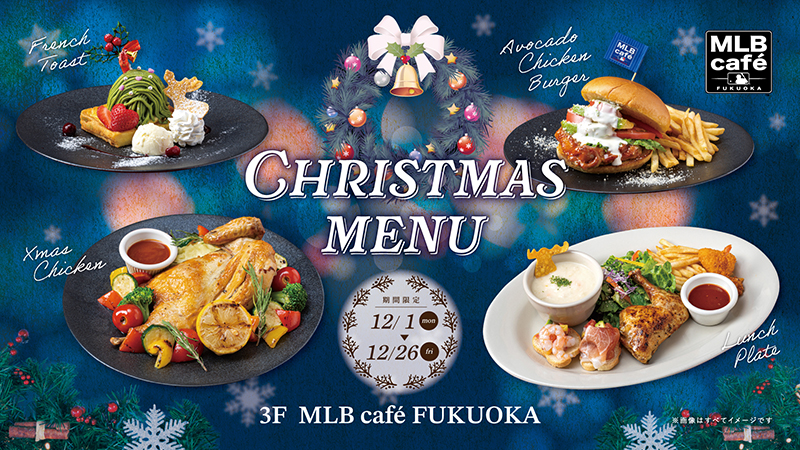 BOSS E・ZO FUKUOKA 3F「MLB café FUKUOKA」では、12月1日(月)~12月26日(金)までクリスマスシーズン限定メニューをご用意いたしました。バーガーやランチプレート・チキン・スイーツなど、この時期だけの特別な味わいをお楽しみいただけます。ご家族や大切な方と一緒に素敵なひと時をお過ごしください。