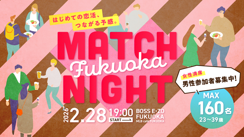 2026年2月28日(土)、最大160名規模の街コンイベント「MATCH NIGHT Fukuoka」をBOSS E・ZO FUKUOKA 3F「MLB café FUKUOKA」で開催します!福岡よしもとの芸人「むなかったん」がMCとして登場!会場を笑いと熱気で包み込み、自然と会話が生まれる盛り上がり必至の企画をご用意♪参加者全員に福岡ソフトバンクホークス主催2026年オープン戦の招待券をプレゼントするほか、イベント中には豪華景品が当たるチャンスも!出会いも楽しさも欲張りたい方におすすめの特別な一夜です。ぜひこの機会にE・ZOで恋活しよう!女性満席となりましたが、まだまだ男性参加者募集中です♪ぜひご参加お待ちしております!(※1/22更新)