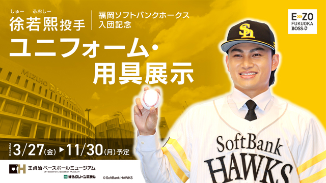 福岡ソフトバンクホークスに新加入した徐若熙投手の入団を記念し、BOSS E・ZO FUKUOKA4F「王貞治ベースボールミュージアム Supported by 博多グリーンホテル」にて、本人着用ユニフォームおよび実使用用具の展示を実施します。