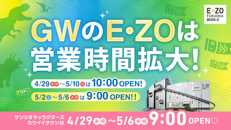 GWのE・ZOは営業時間拡大!4月29日(水・祝)~5月10日(日)は平日も10:00オープン!さらに!5月2日(土)~6日(水・休)は9:00オープン!楽しさ満載のE・ZOでご家族や友人とGWの思い出を作ろう!