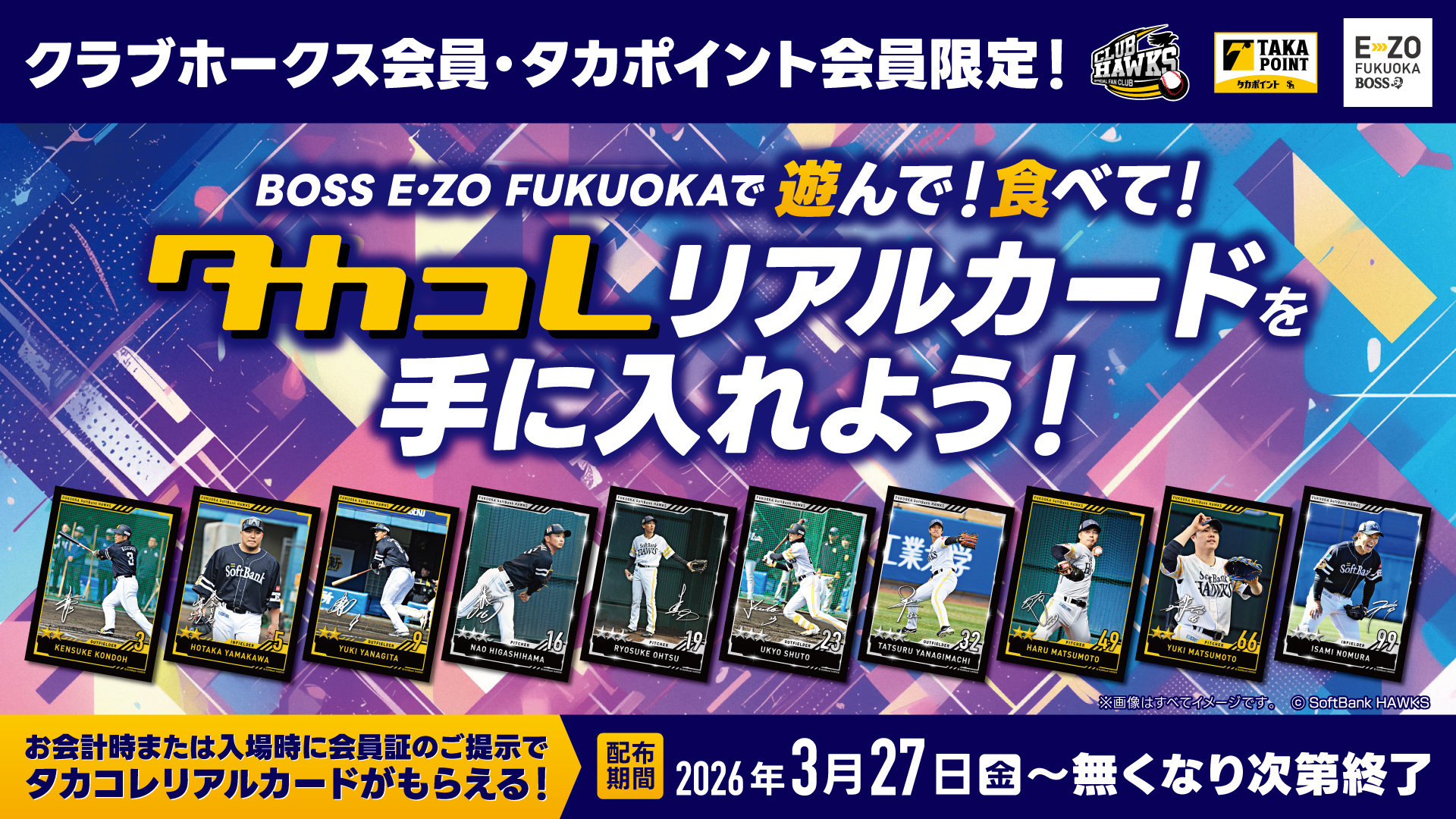 BOSS E・ZO FUKUOKA内のアトラクションまたは飲食店舗ご利用で、「クラブホークス会員証」または「タカポイント会員証」をご提示の方に『タカコレリアルカード「2026シーズンスタートバージョン」』 をプレゼントいたします。