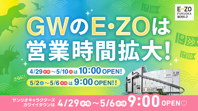 GWのE・ZOは営業時間拡大!4月29日(水・祝)~5月10日(日)は平日も10:00オープン!さらに!5月2日(土)~6日(水・休)は9:00オープン!楽しさ満載のE・ZOでご家族や友人とGWの思い出を作ろう!