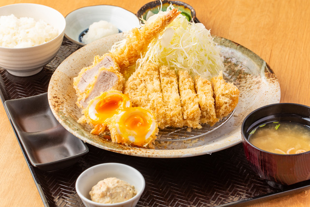 | 商品説明 | 銘柄豚のとんかつ(ロースとヒレの2種類)、海老フライ、半熟卵でサイクルヒットを表現した、ボリューム満点の一皿! 味もボリュームも、まさにサイクルヒット級です。 |