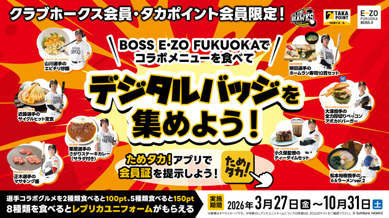BOSS E・ZO FUKUOKA 3階 「The FOODHALL」では、3月27日(金)より「選手コラボグルメ」を販売いたします。一部店舗では昨年の内容からリニューアルして登場!また、「ためタカ!」アプリでは、「選手コラボグルメ」を食べると限定デジタルバッジがもらえる!集めたデジタルバッジの個数に応じてタカポイントや素敵な景品がもらえるキャンペーンも開催します。