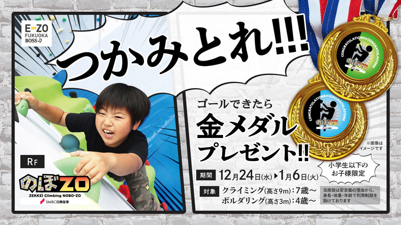 「絶景3兄弟 のぼZO SMBC日興証券」では、冬休み特別企画としてお子さまに大人気の「金メダルチャレンジ」を開催します!小学生以下のお客様を対象に、見事チャレンジが成功すると、オリジナルの金メダルを贈呈します。高さ約9メートルの「クライミング」では、緑色ベースの金メダル、高さ約3メートルの「ボルダリング」では青色ベースの金メダルをプレゼント!寒さを吹っ飛ばして、金メダルつかみとれ!!挑戦をお待ちしております。