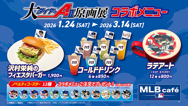 BOSS E・ZO FUKUOKA 3F「MLB café FUKUOKA」では、「大『ダイヤのA actⅡ』原画展」とコラボグルメを販売!オリジナルのバーガーやドリンク、ラテアートなどお楽しみいただけます。さらに、コラボメニューご注文でノベルティをプレゼント!
