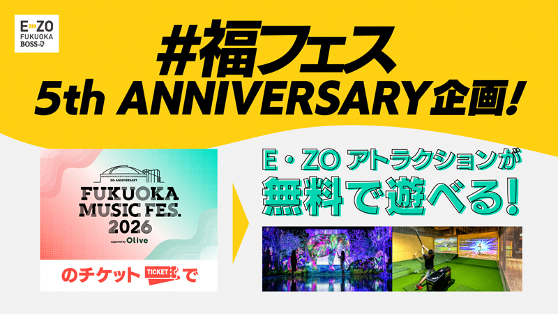 BOSS E・ZO FUKUOKAでは、「FUKUOKA MUSIC FES.2026 supported by Olive(通称:福フェス)」の5回目の開催を記念した「福フェス 5th ANNIVERSARY」企画を開催!「FUKUOKA MUSIC FES.2026 supported by Olive」の入場チケットをご提示いただくと、対象アトラクションを2つまで無料で体験いただけます!
